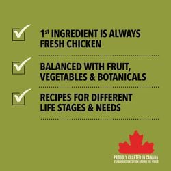 - 1st ingredient is fresh Canadian chicken. Our fresh ingredients use refrigeration as the sole method of preservation and our raw ingredients are frozen at their peak freshness.