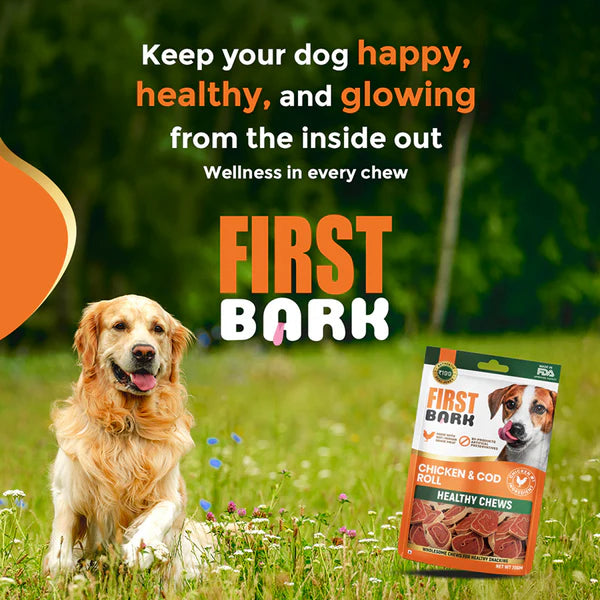 First Bark Chicken & Cod Roll – Healthy Chews Dog Treats are premium dual-protein roll chews for dogs seeking wholesome nutrition and extended chewing satisfaction with 100% human grade meat.