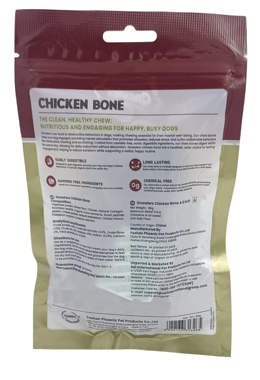 Gnawlers All Natural Small 4.5 inch Chicken Bone formulated for safer chewing. Made with real chicken and natural chicken flavour, these long-lasting chews provide mental stimulation and help reduce boredom-related behaviors.