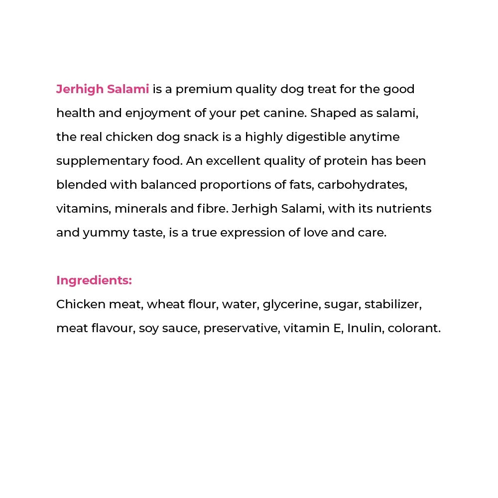 - JerHigh Salami is a premium snack filled with nutrients and vitamins to make your dog healthy and strong, with a tempting chicken flavor that your dog wont be able to resist. Its presented in a salami sausage-shaped snack, great for all dog breeds. Nutritious and delicious, its the perfect treat to reward your special friend!