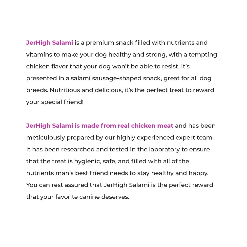 - JerHigh Salami is a premium snack filled with nutrients and vitamins to make your dog healthy and strong, with a tempting chicken flavor that your dog wont be able to resist. Its presented in a salami sausage-shaped snack, great for all dog breeds. Nutritious and delicious, its the perfect treat to reward your special friend!