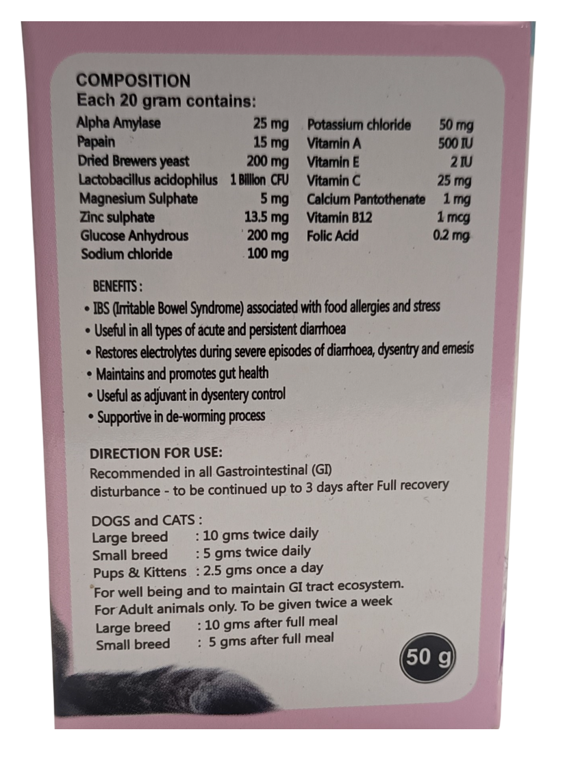 Each 20 gram contains: Alpha Amylase 25 mg, Papain 15 mg, Dried Brewers Yeast 200 mg, Lactobacillus acidophilus 1 Billion CFU, Magnesium Sulphate 5 mg, Zinc Sulphate 13.5 mg, Glucose Anhydrous 200 mg, Sodium Chloride 100 mg, Potassium Chloride 50 mg, Vitamin A 500 IU, Vitamin E 2 IU, Vitamin C 25 mg, Calcium Pantothenate 1 mg, Vitamin B12 1 mcg, Folic Acid 0.2 mg.