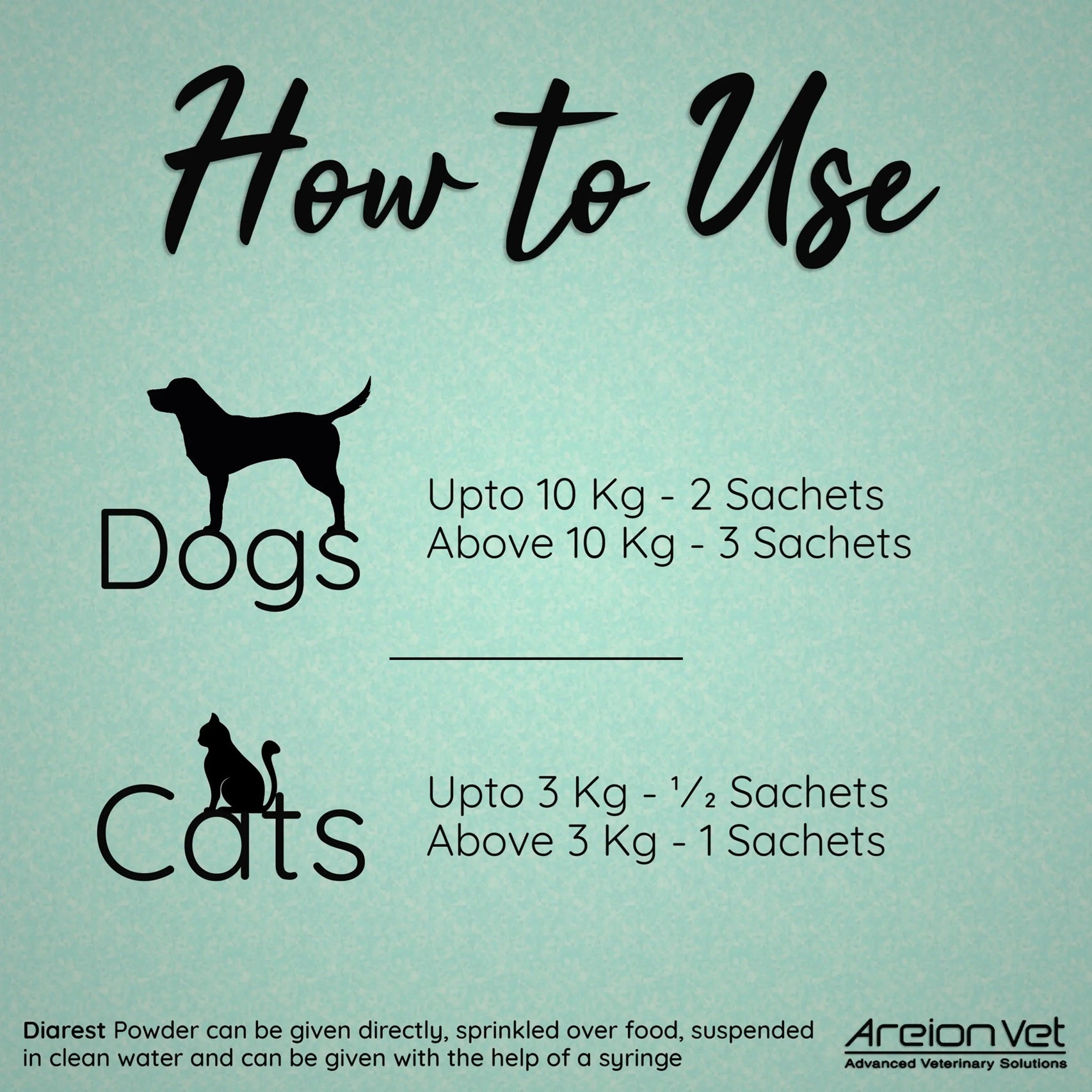 - Cats: Upto 3 kg - ½ sachet daily; Above 3 kg - 1 sachet daily.