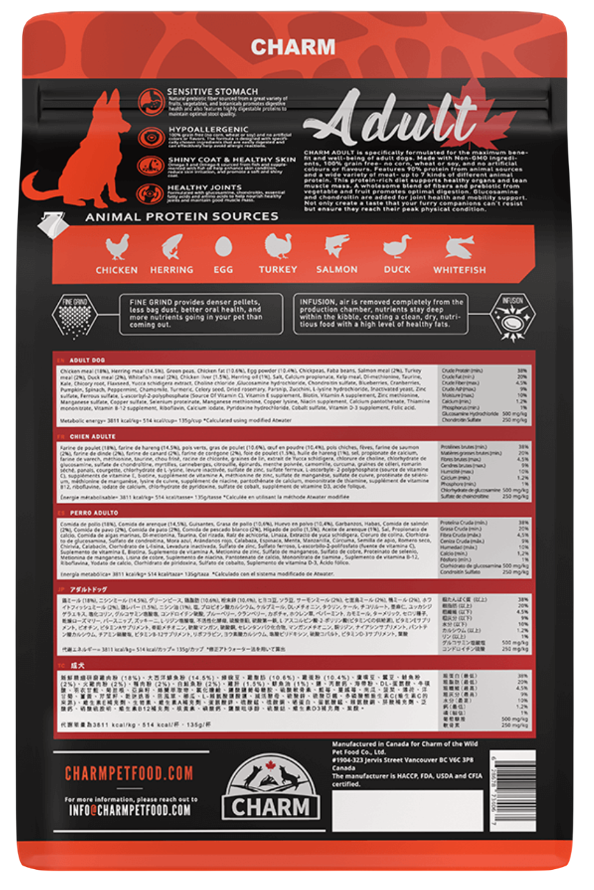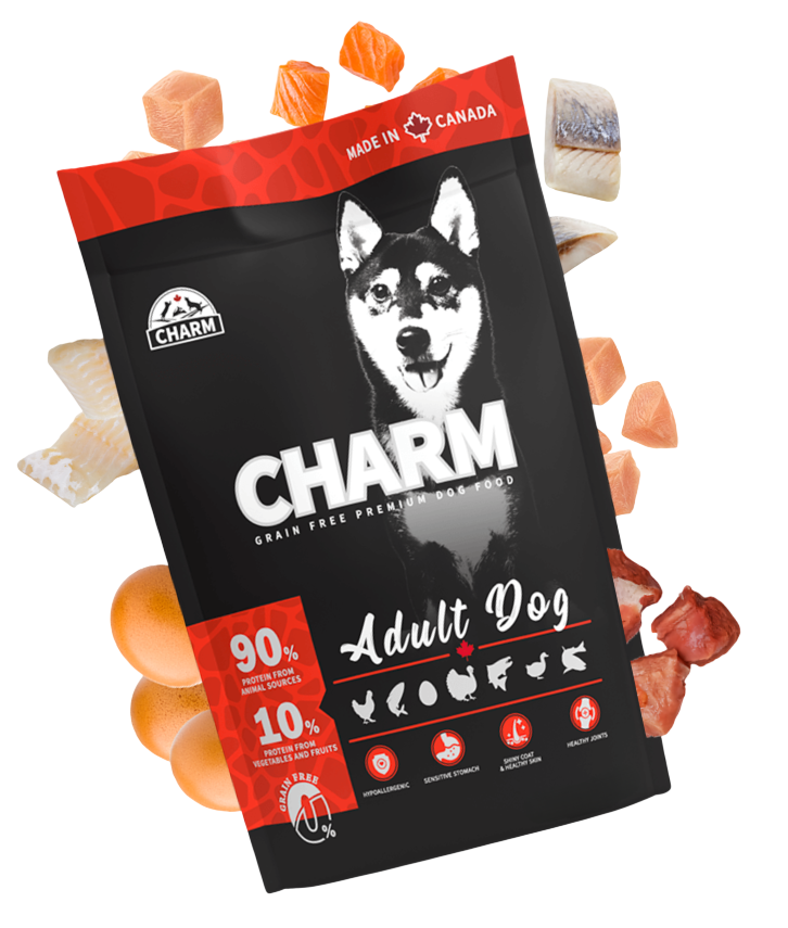 Charm Grain Free Premium Adult Dog Food is a high-protein, grain-free formula designed for adult dogs of all breeds. Made in Canada, this premium dog food features 90% protein from animal sources and 10% from vegetables and fruits, providing complete and balanced nutrition. The hypoallergenic recipe is specially formulated for dogs with sensitive stomachs while supporting shiny coats and healthy joints.