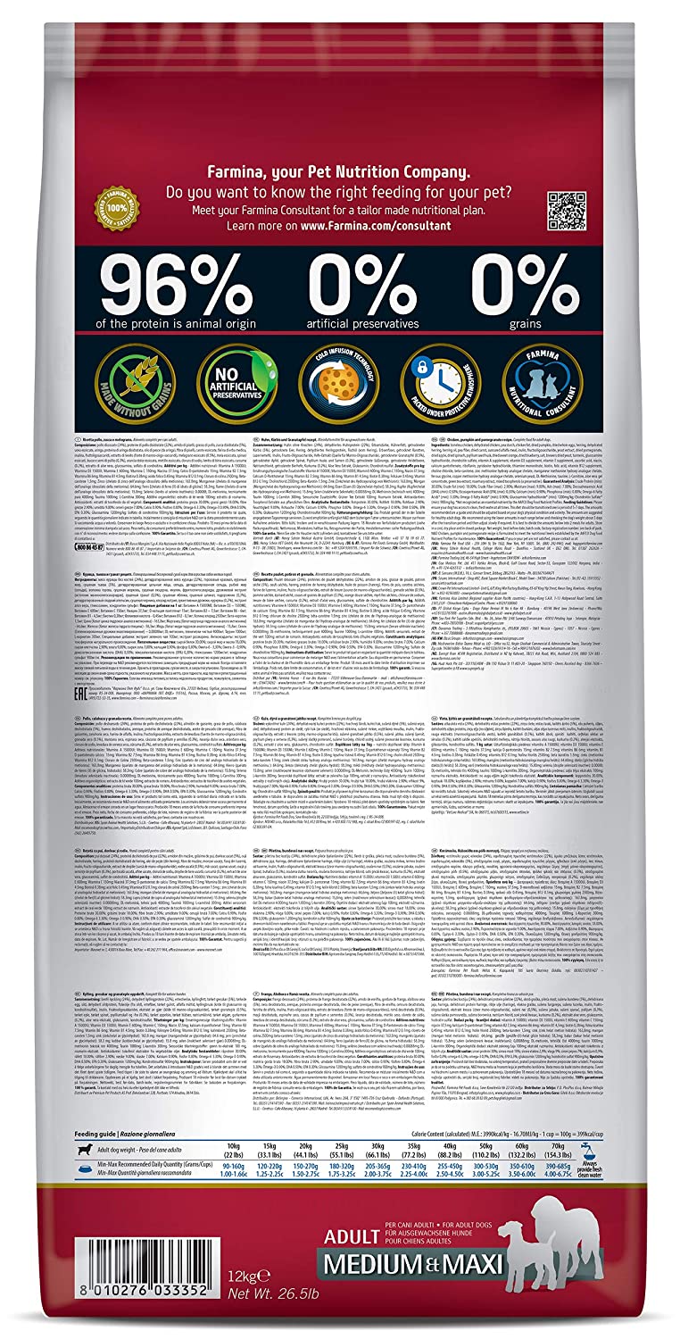 - Grain Free. 60% premium animal ingredients. 40% fruits, minerals and vegetables. 0% cereals.