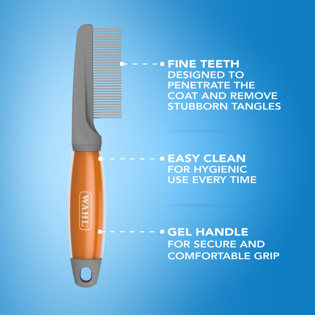 Wahl Grooming Comb has a non-slip ergonomic gel handle that makes handling the brush simple. Stainless steel teeth designed to penetrate the root of your pet's coat and to remove mats and tangles with very little tugging as they penetrate to the root of your pet's coat. Regular combing breaks up matted fur and tangles.