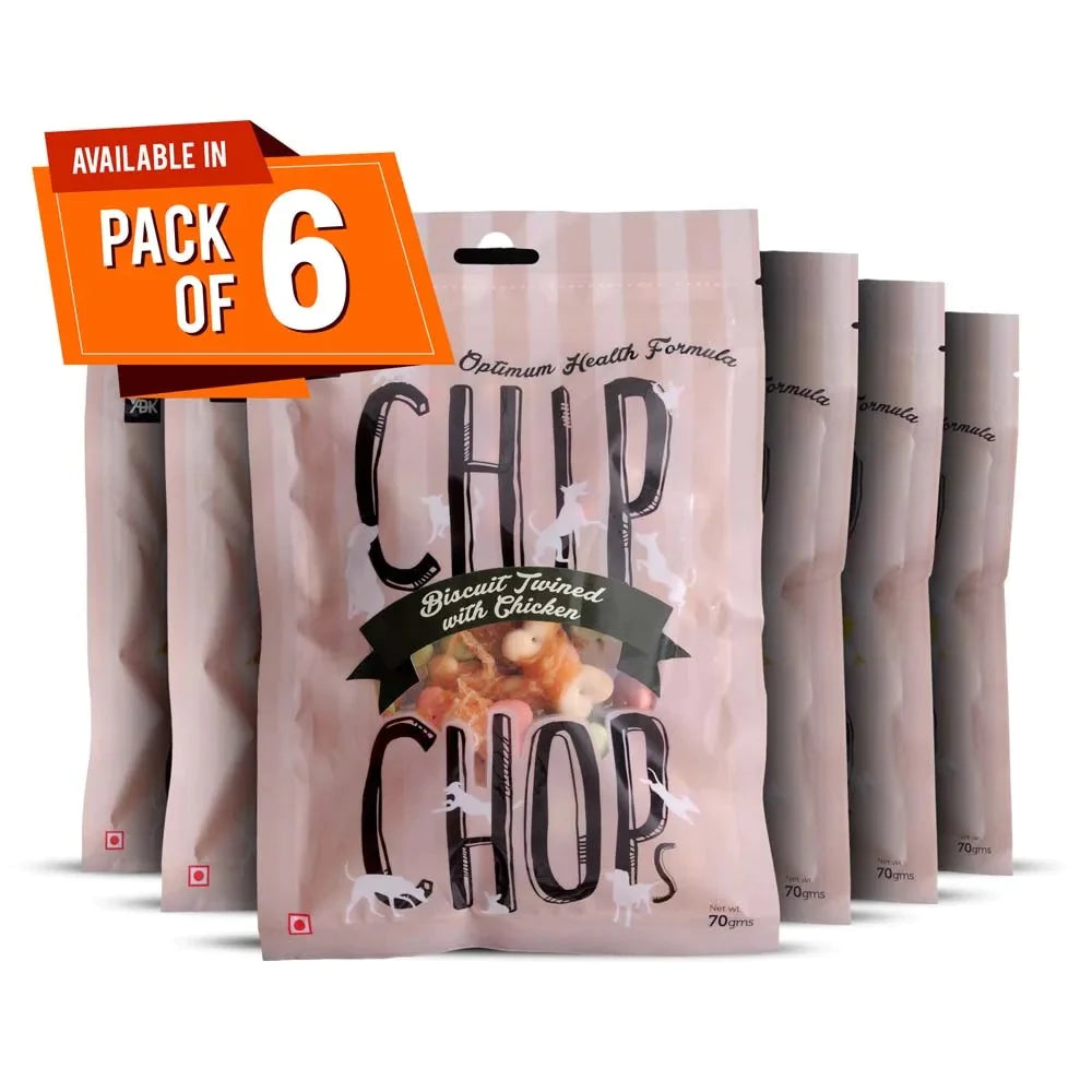 Chip Chops Biscuit Twined with Chicken Dog Treats are High-protein chicken-twined biscuit dog treats made from fresh meat with natural chicken coating. FDA APPA approved for quality assurance.