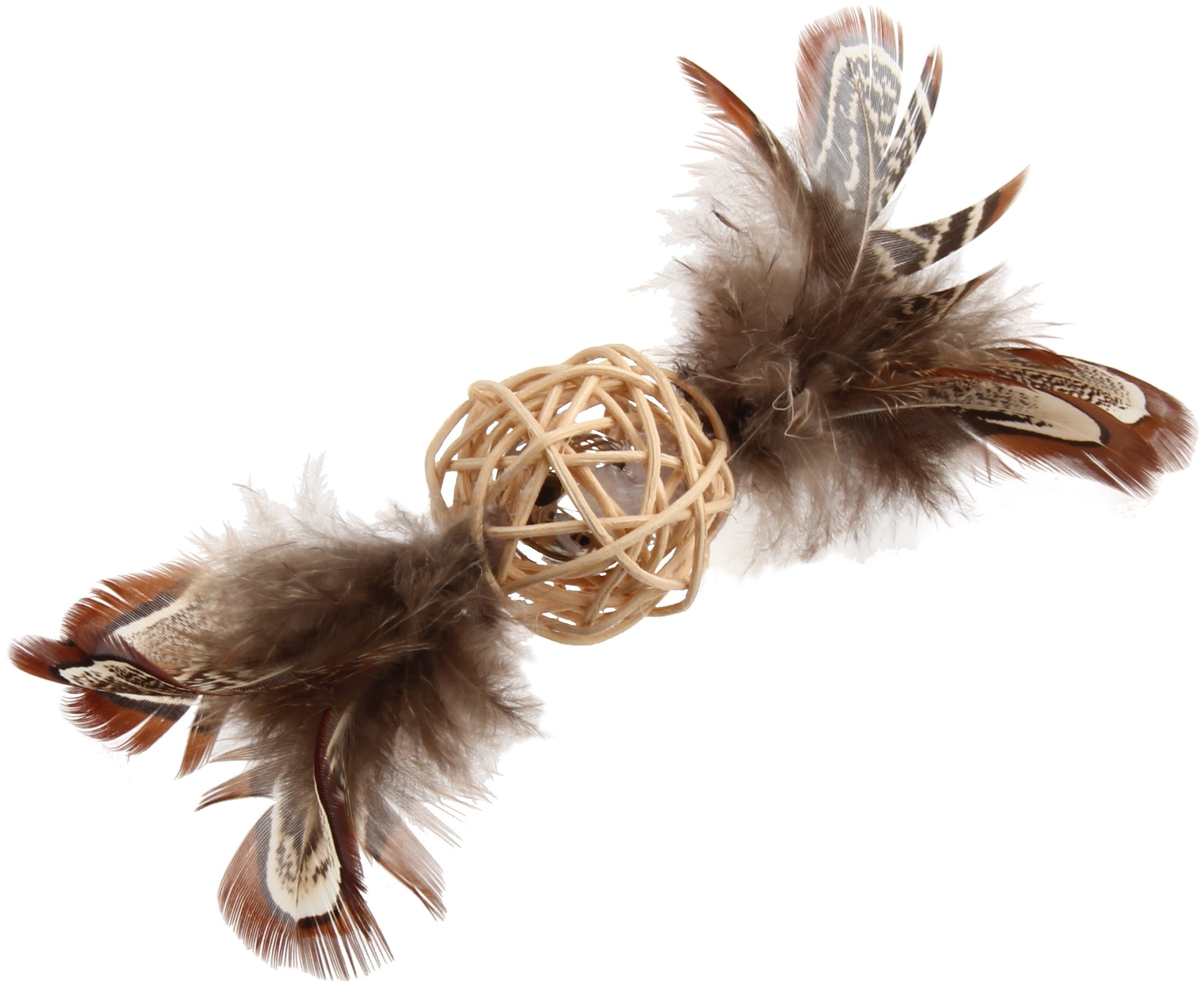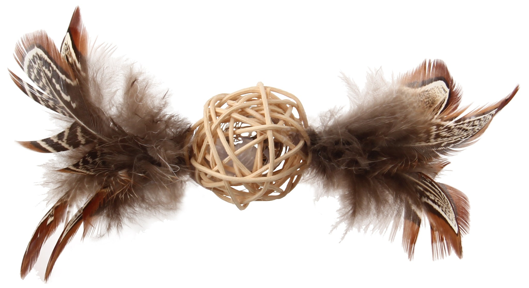 At the center is a woven rattan wood ball that is lightweight yet durable, perfect for batting and grabbing. The built-in rattle sound activates during play, sparking curiosity and encouraging repeated interaction. On both sides, soft natural feathers add unpredictable movement, making the toy ideal for chasing, pouncing, and swatting.