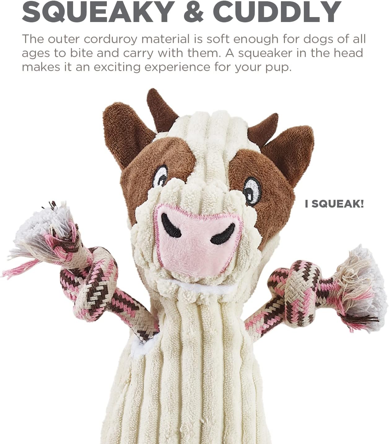 - Durable Plush, Interactive Toy with Corduroy Body: Soft yet tough corduroy fabric stands up to enthusiastic chewers while remaining gentle on your dog’s mouth. This farm-inspired durable plush toy is as cute as it is tough. Constructed with tough and rambunctious pups in mind who love to play fetch, tug, toss, and more!