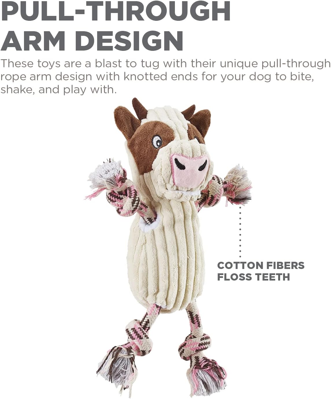Outward Hound Ranch Roperz Cow Plush Squeaky Dog Toy – White | Pull-Through Rope Arms | Tough Corduroy Body | Durable Tug & Squeak Toy