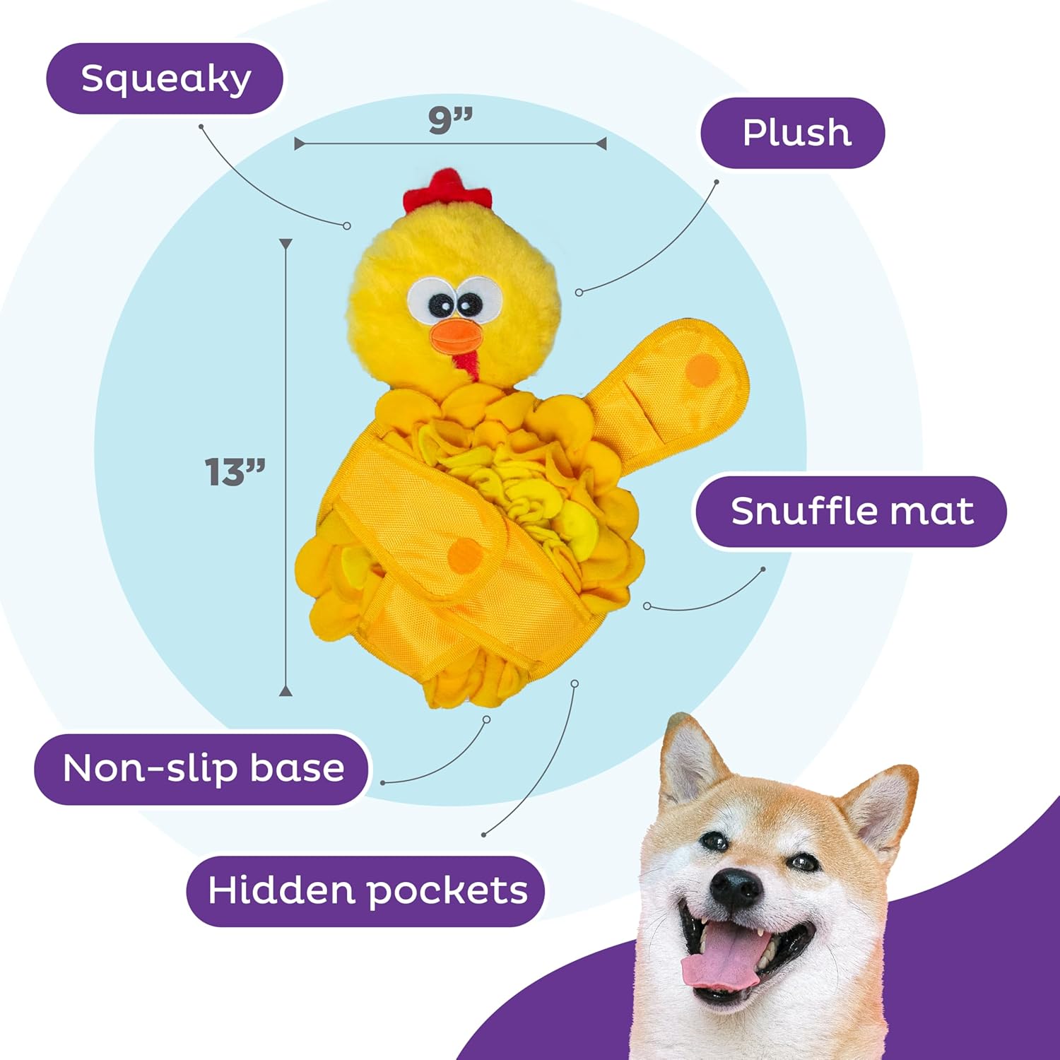 With hidden treat pockets, multiple fabric layers, and a non-slip base, the Snuffle Palz Chicken provides a safe and rewarding challenge. Its soft plush head includes a built-in squeaker for added excitement, while the crinkly feet offer extra sensory stimulation. Measuring 13 inches tall and 9 inches wide, it’s an ideal interactive toy for dogs of all sizes.