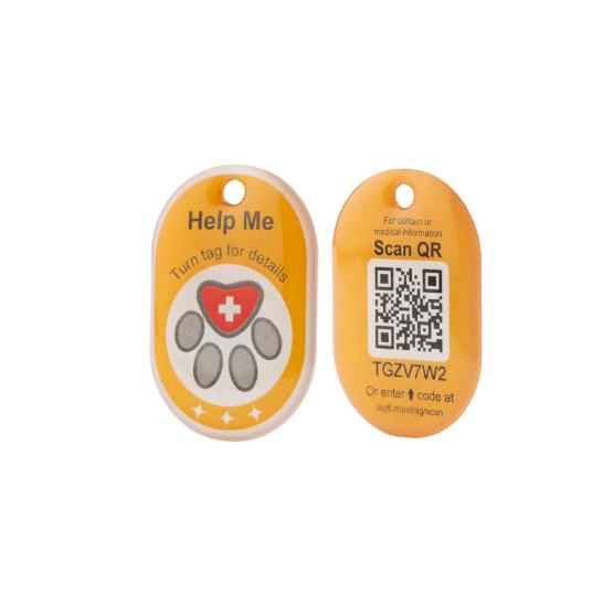 The TAG8 Genie Smart Pet ID Tag combines traditional pet identification with modern QR code technology for comprehensive pet safety. This oval-sized smart tag features a durable yellow paw print design with an embedded QR code on the reverse, allowing anyone who finds your pet to quickly access your contact details by scanning the code. The tag displays "Help Me" messaging and includes both visual identification and digital contact information storage.