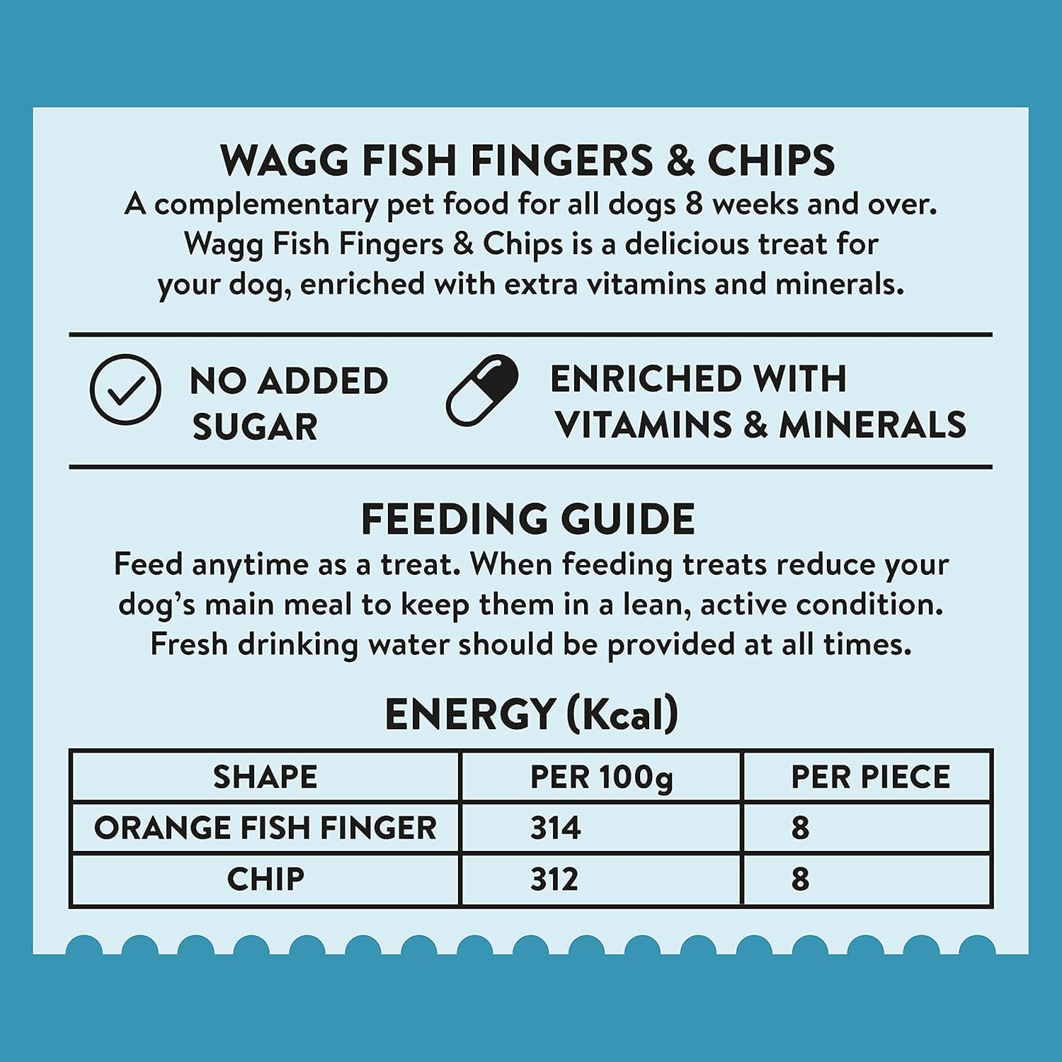 Wagg Oven-Baked Fish Fingers & Chips Dog Treats with Fish & Potato is an oven-baked treat with classic fish and potato flavors, enriched with vitamins and minerals for complete nutrition.