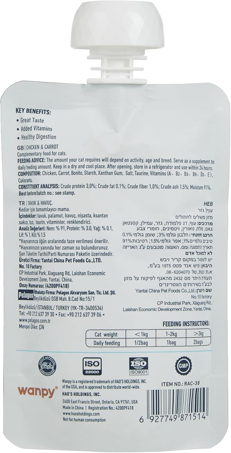 Wanpy Tasty Meat Paste – Chicken & Carrot Cat Treat is a Premium chicken with beta-carotene rich carrots in a lickable squeeze pouch. Vitamin-enriched wet cat treats for eye health and immune support.