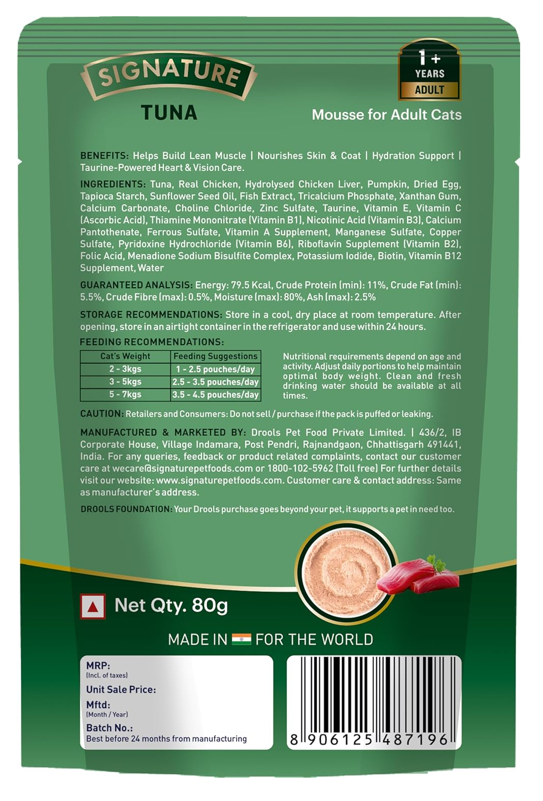 Signature Complete Nutrition Tuna Mousse is a premium mousse for adult cats (1+ years) made with 100% real ingredients, 0% grain content, and 0% added preservatives. This smooth, palatable mousse helps build lean muscle, nourishes skin & coat, provides hydration support, and delivers taurine-powered heart & vision care.