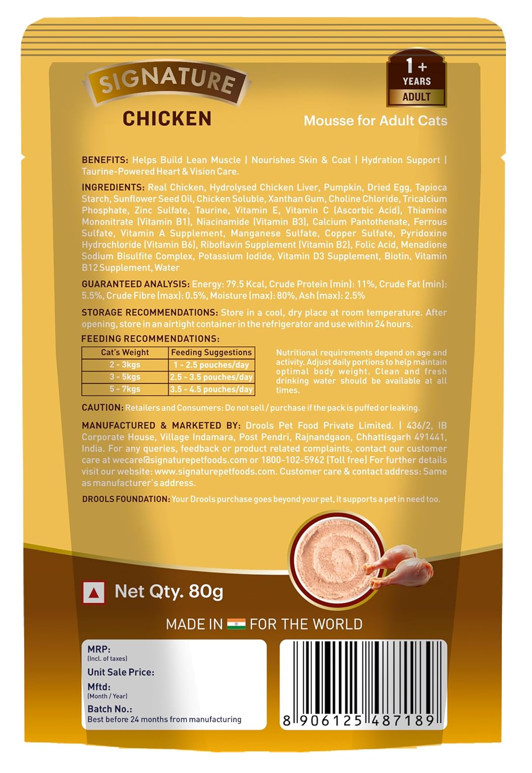 Signature Complete Nutrition Chicken Mousse is a premium mousse for adult cats (1+ years) made with 100% real ingredients, 0% grain content, and 0% added preservatives. This smooth, palatable mousse helps build lean muscle, nourishes skin & coat, provides hydration support, and delivers taurine-powered heart & vision care.