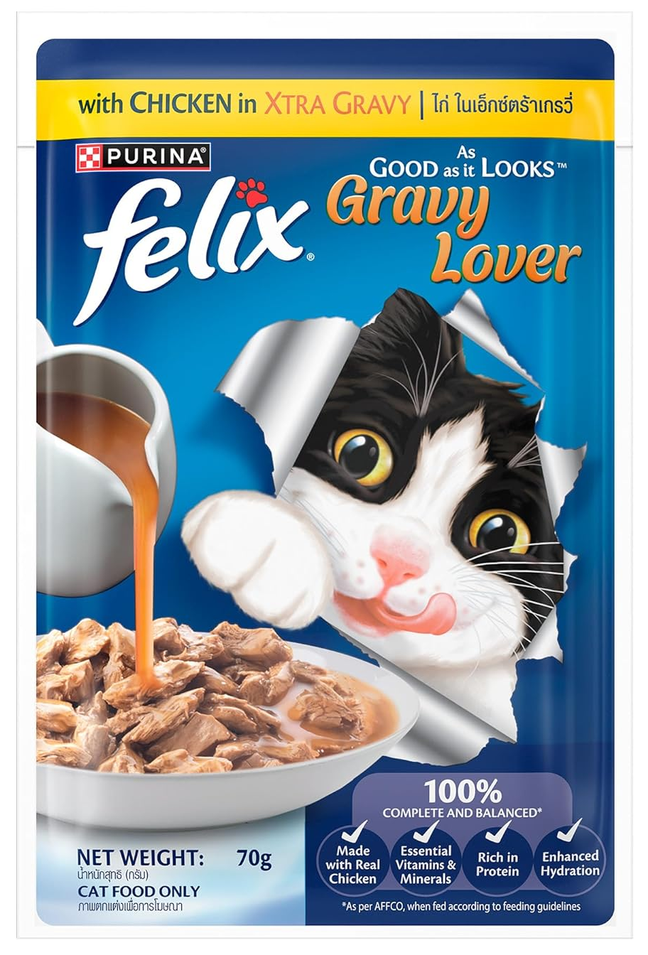 Felix Gravy Lover Chicken in Extra Gravy is a complete and balanced wet cat food designed specifically for adult cats. Made with real chicken, this formula delivers 100% complete nutrition with enhanced hydration, essential vitamins and minerals, and rich protein content. Each 70g pouch provides a delicious meal that satisfies gravy-loving cats while meeting their nutritional needs.