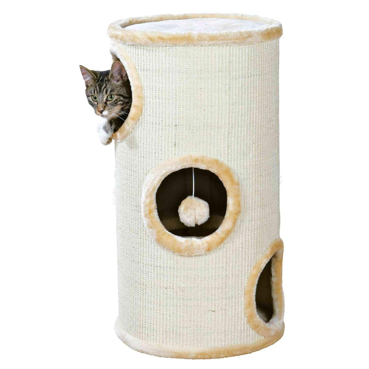 Trixie Samule 3 Storey Cat Tower offers cats the opportunity to live out their natural scratching habits. At the same time, it offers an interesting cat playground and a nice and cozy retreat. This cat tower features a padded platform. A catnip toy on string entices cats.
