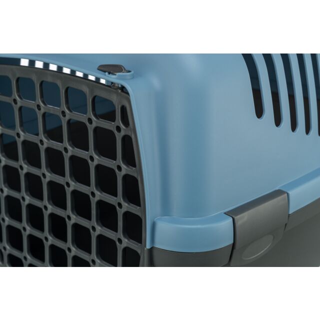 This Trixie Capri 3 Pet Carrier features a light blue top with charcoal gray base, offering both front wire door and top-loading access for versatile pet handling. The carrier includes extensive side ventilation slots, a reinforced carrying handle, and secure locking mechanisms, making it perfect for cats and small dogs during veterinary visits, car travel, and short trips.