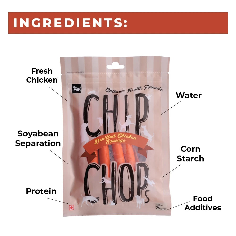 Chip Chops Devilled Chicken Sausage Dog Treats are High-protein deviled chicken sausage dog treats made from fresh meat with savory spice blend. FDA APPA approved for quality assurance.