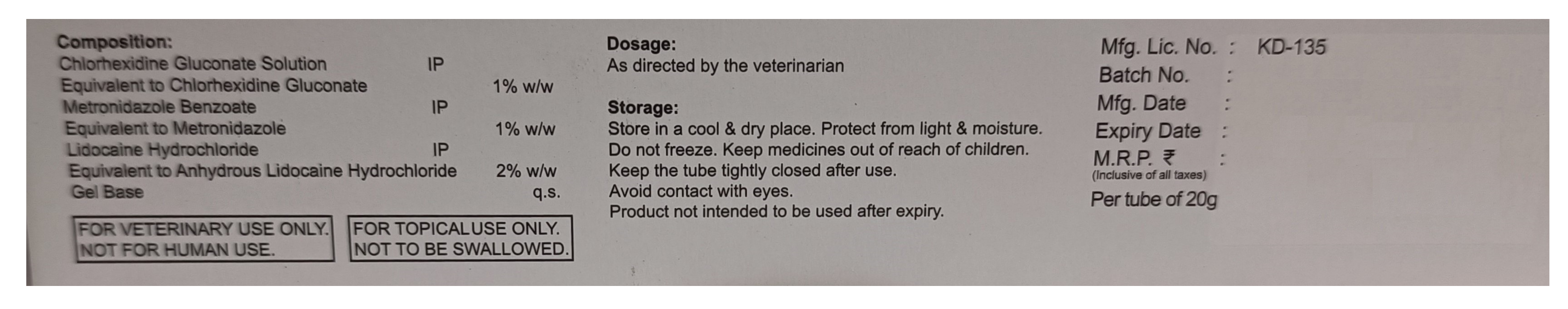 Metlichlo Dog is a triple-action oral gel for dogs containing Chlorhexidine Gluconate (1% w/w), Metronidazole (1% w/w), and Lidocaine Hydrochloride (2% w/w). This veterinary formulation may help manage bacterial and protozoal oral infections while providing localized pain relief. The gel is designed for topical application inside the dog's mouth to address gingivitis, stomatitis, and other oral cavity infections. The gel is manufactured by Fredun Pharmaceuticals Ltd. under the Freossi brand and is available in 20g tubes.