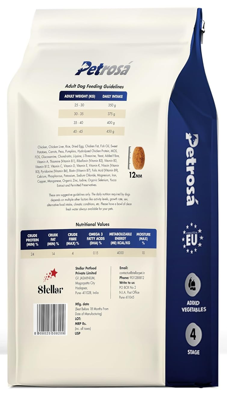Petrosa Adult Dog Food For Large Breed is a complete and balanced diet formulated for large breed adult dogs (12 months and above) weighing 25-45 kg. Manufactured by Stellar Petfood Private Limited, this Stage 4 formula features chicken as the primary protein source, combined with wholesome grains, vegetables, and essential nutrients.