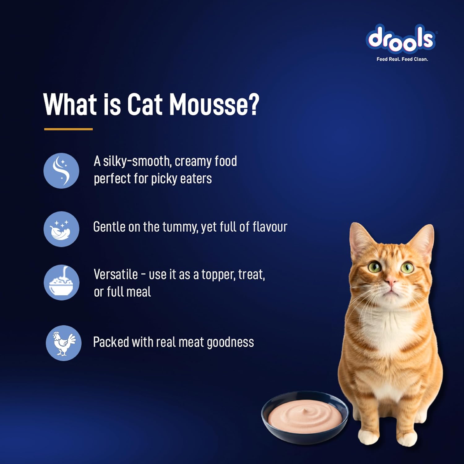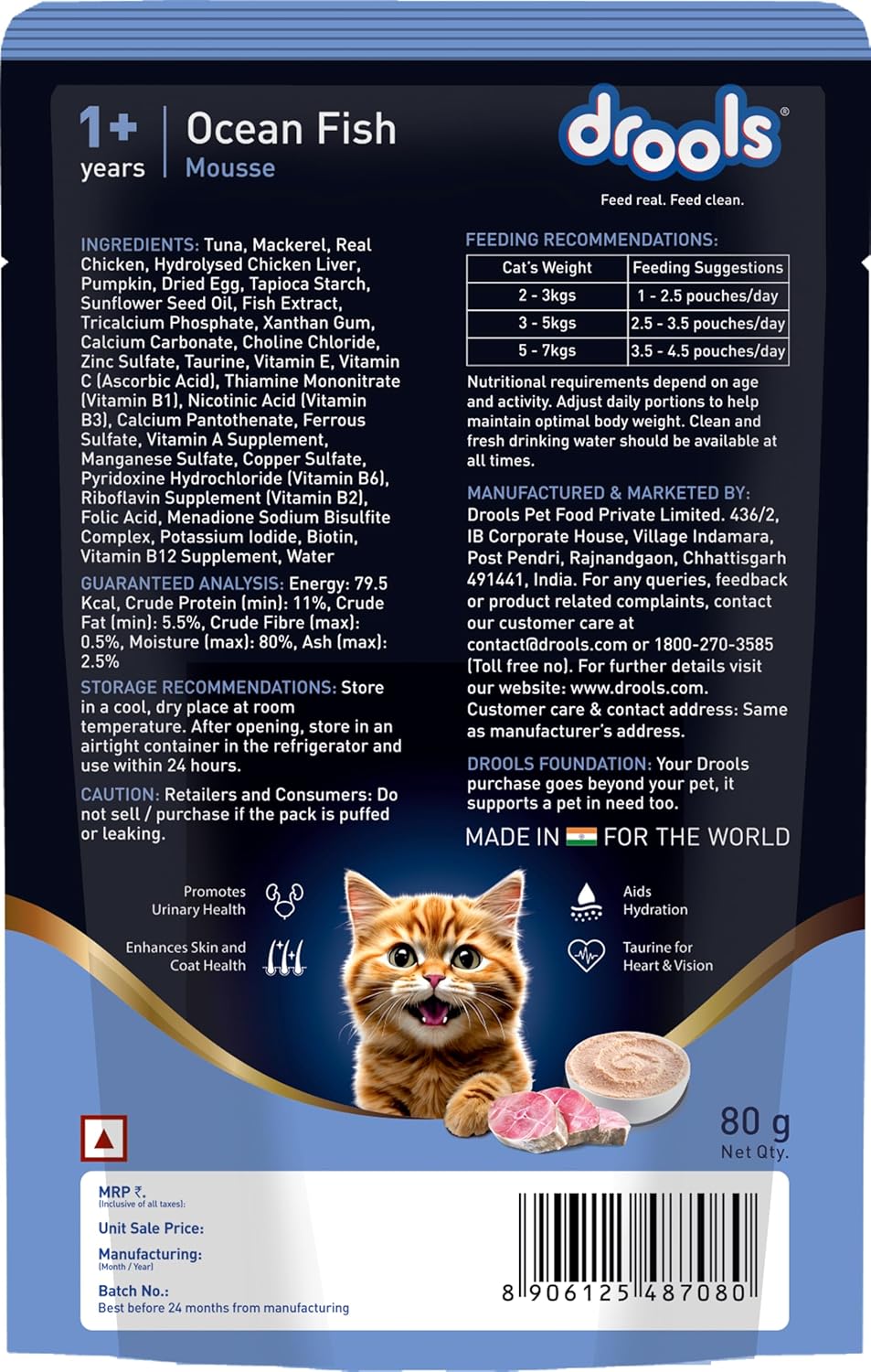 Drools Ocean Fish Mousse is a premium complete and balanced wet food specially formulated for adult cats aged 1 year and above. Feed real. Feed clean. Made in India for the world, this silky-smooth creamy mousse features real Tuna and Mackerel as the primary ocean fish proteins — combined with Real Chicken and Hydrolysed Chicken Liver to deliver high-quality, easily digestible nutrition for muscle maintenance and overall vitality, every single day.