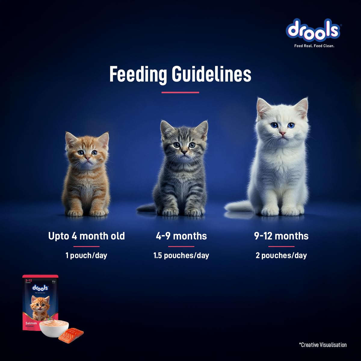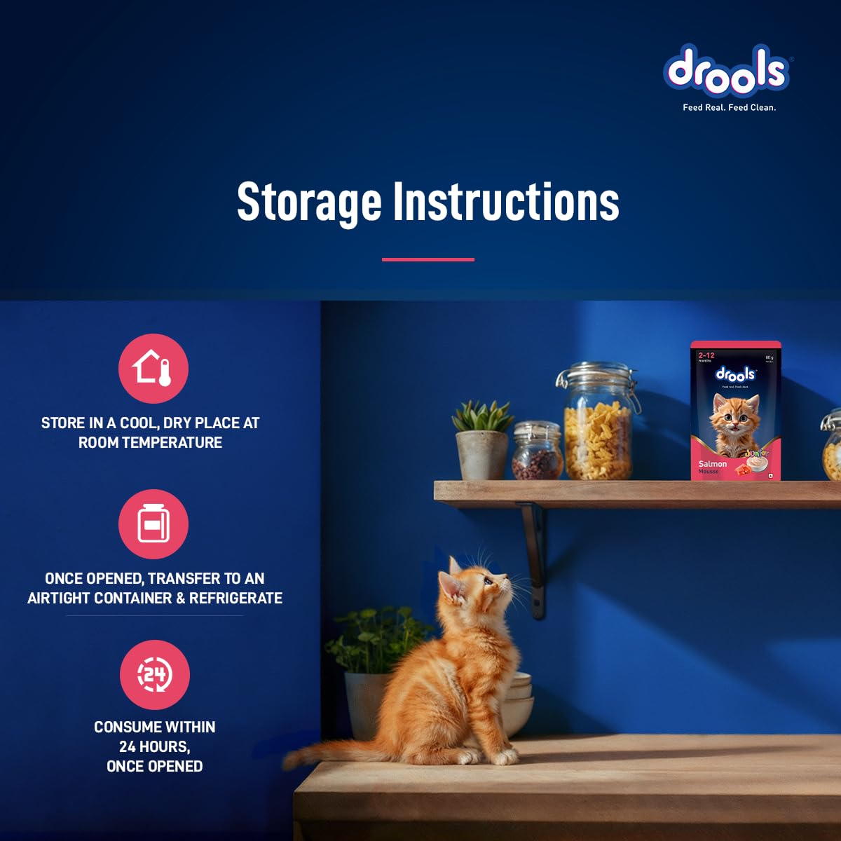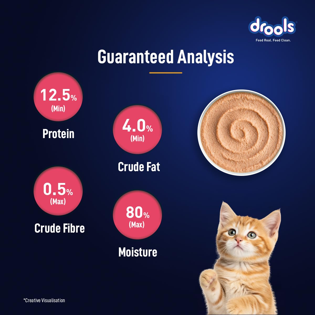 Drools Junior Salmon Mousse is a premium complete and balanced wet food specially formulated for kittens aged 2–12 months. Feed real. Feed clean. Made in India for the world, this silky-smooth mousse features real Salmon as the primary ingredient — combined with Real Chicken, Hydrolysed Chicken Liver, and Salmon Oil — delivering high-quality, omega-rich protein for healthy muscle development, growth, and coat health during the crucial early months of your kitten's life.