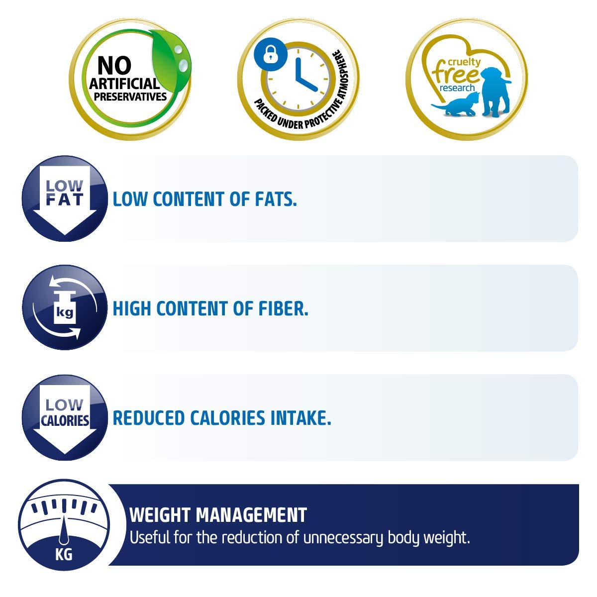 - Low level of fats: Fats have the highest energetic density among nutrients. It is necessary to reduce the quantity of this highly caloric nutrient to reduce the total energetic density of the product.