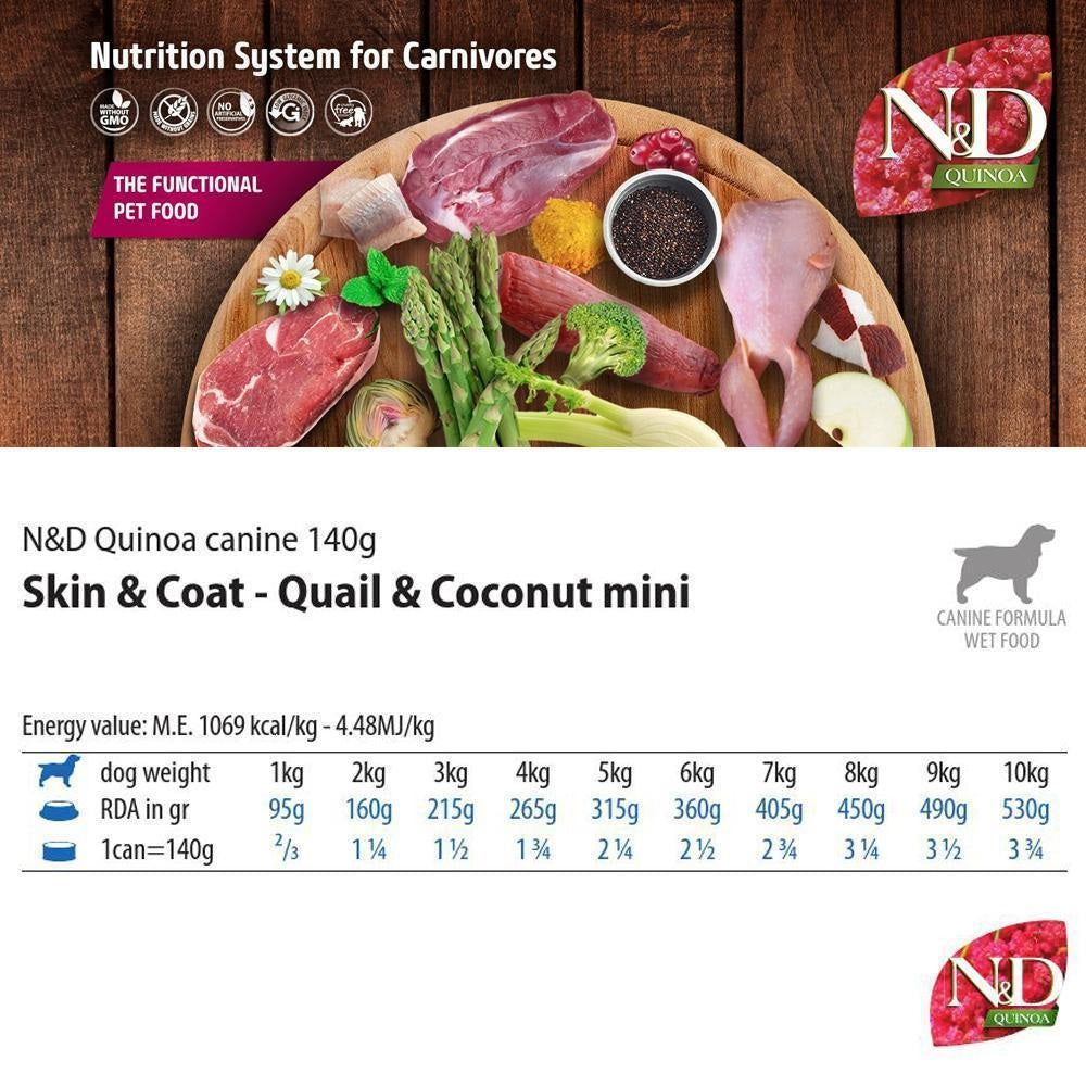 - Complete wet food for adult dogs. N&D Quinoa Skin & Coat is a complete dietetic food for dogs, suggested for the reduction of ingredient and nutrient intolerances.