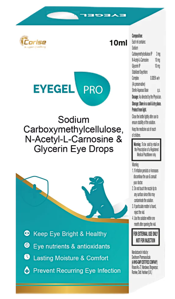 Eyegel Pro Eye Drops by Corise Healthcare is a prescription veterinary ophthalmic solution formulated to support optimal ocular health in dogs and cats. This lubricating eye drop combines Sodium Carboxymethylcellulose IP, N-Acetyl-L-Carnosine, and Glycerin IP to provide comprehensive eye moisture, antioxidant support, and lasting comfort for pets experiencing dry eyes or age-related ocular changes.