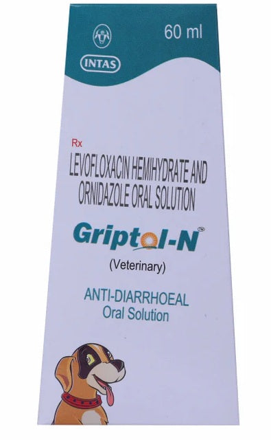 Griptol-N is a veterinary anti-diarrheal oral solution containing levofloxacin hemihydrate and ornidazole. This combination antibiotic medication is used to manage gastrointestinal infections in dogs caused by susceptible bacteria and protozoa. Each 5 ml contains levofloxacin hemihydrate IP 100 mg and ornidazole IP 200 mg in an aqueous base. The 60 ml solution is formulated specifically for veterinary use and comes with a 10 ml measuring spoon for easy administration.