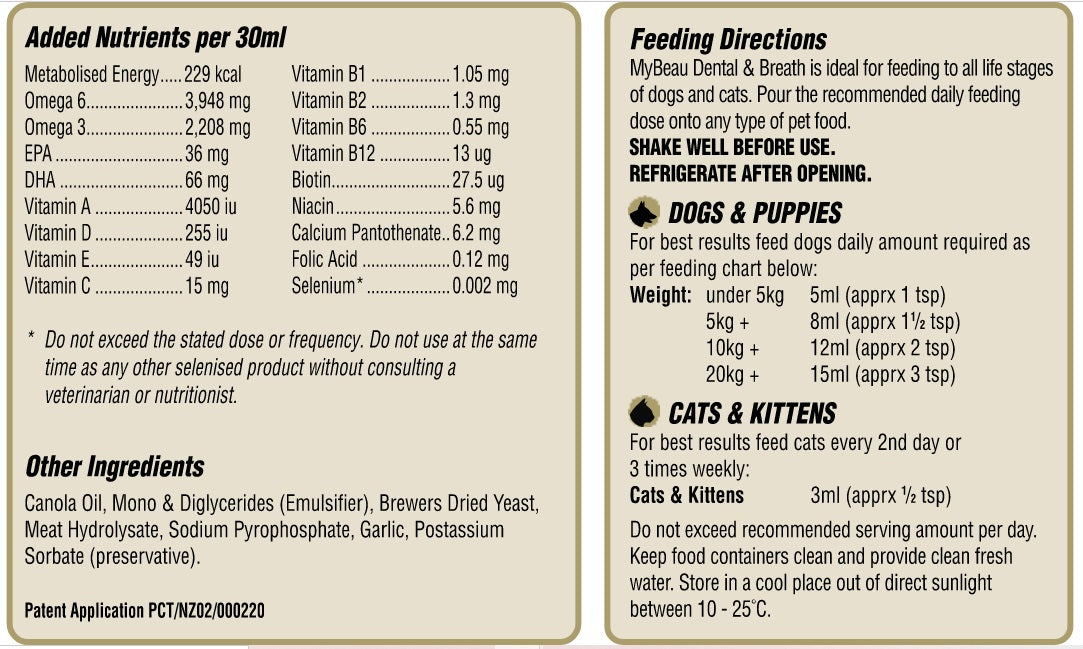 MyBeau Dental & Breath is ideal for feeding to all life stages of dogs and cats. Pour the recommended daily feeding dose onto any type of pet food. SHAKE WELL BEFORE USE. REFRIGERATE AFTER OPENING.