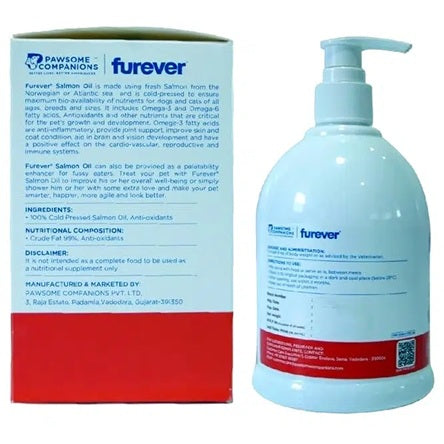 Pawsome Companions Furever Salmon Oil is a premium 100% cold-pressed dietary supplement available in 100ml and 500ml bottles for cats and dogs. This natural omega-rich oil from Norwegian and Atlantic salmon provides essential fatty acids for skin health, coat shine, joint mobility, and overall wellness enhancement.