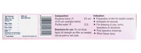 - Active ingredient: Povidone-Iodine I.P. 5% w/v in 200ml solution