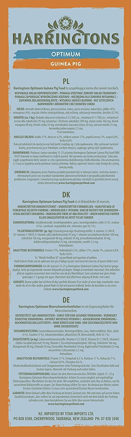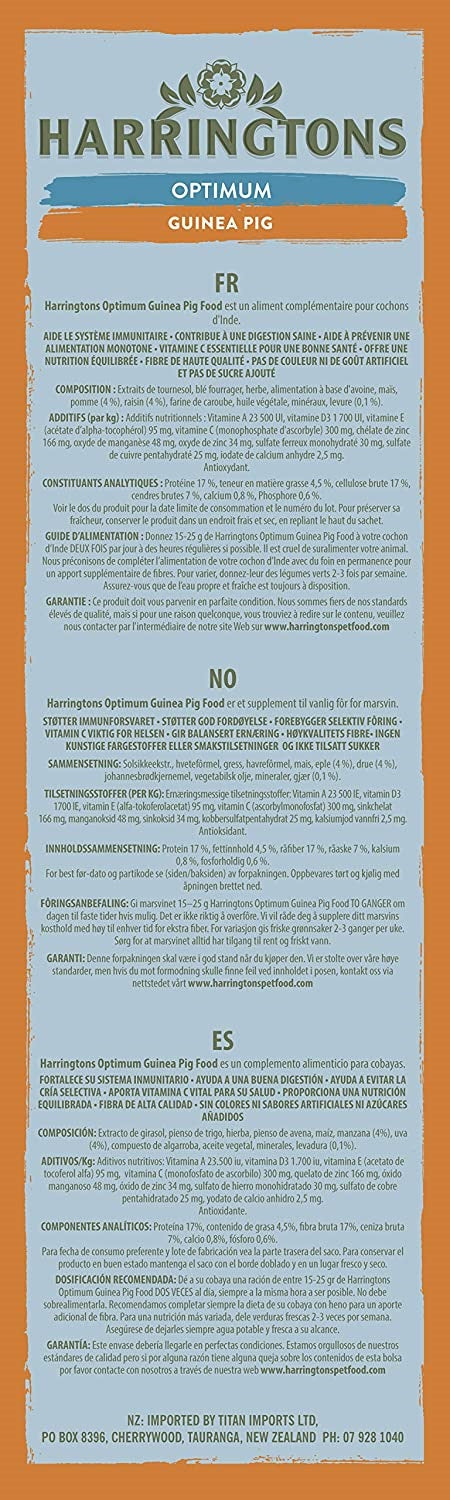 Harringtons The Natural Choice Optimum Guinea Pig Food is a complementary feed for guinea pigs, containing a single all-in-one nugget to help avoid selective feeding. It contains a variety of high quality ingredients in a balanced formulation fortified with vitamins and minerals to help support your guinea pigs immune system.