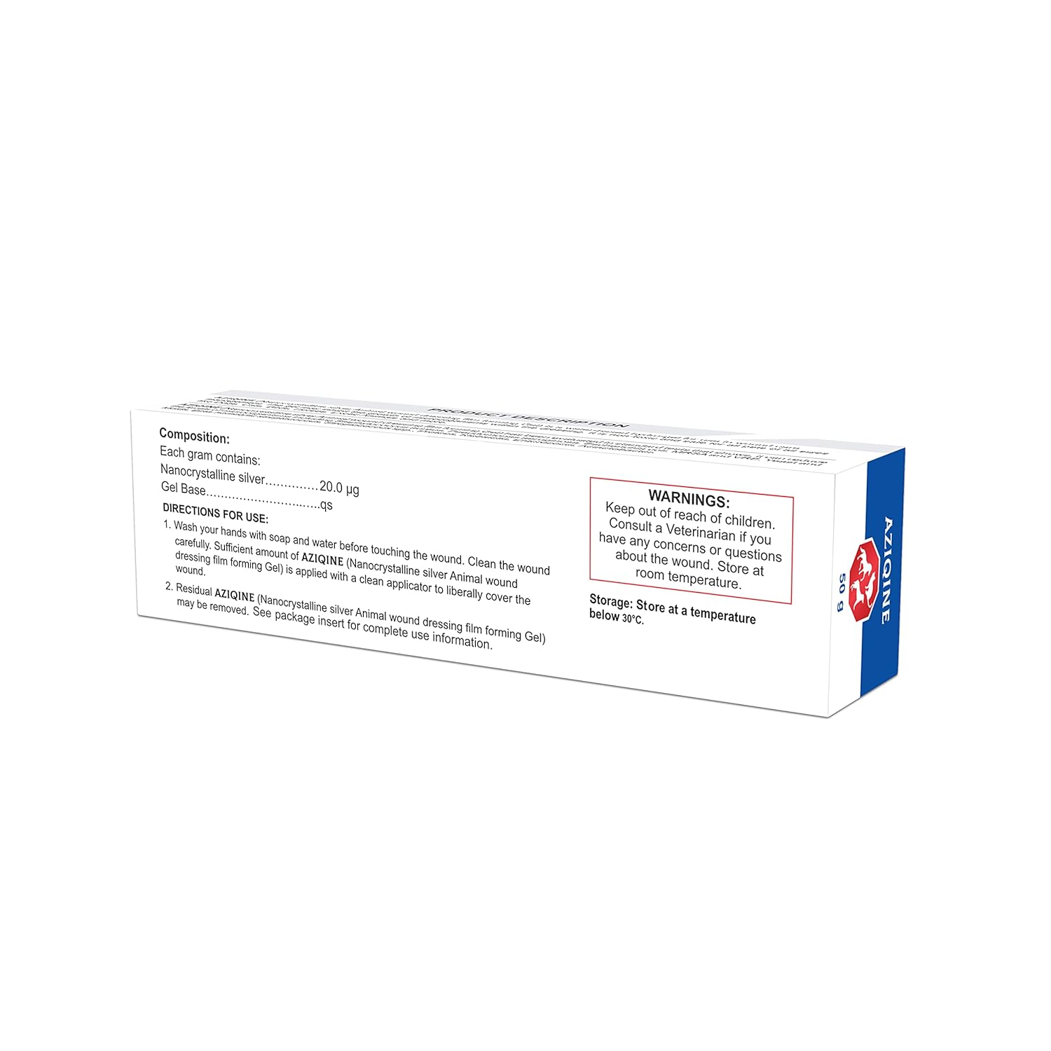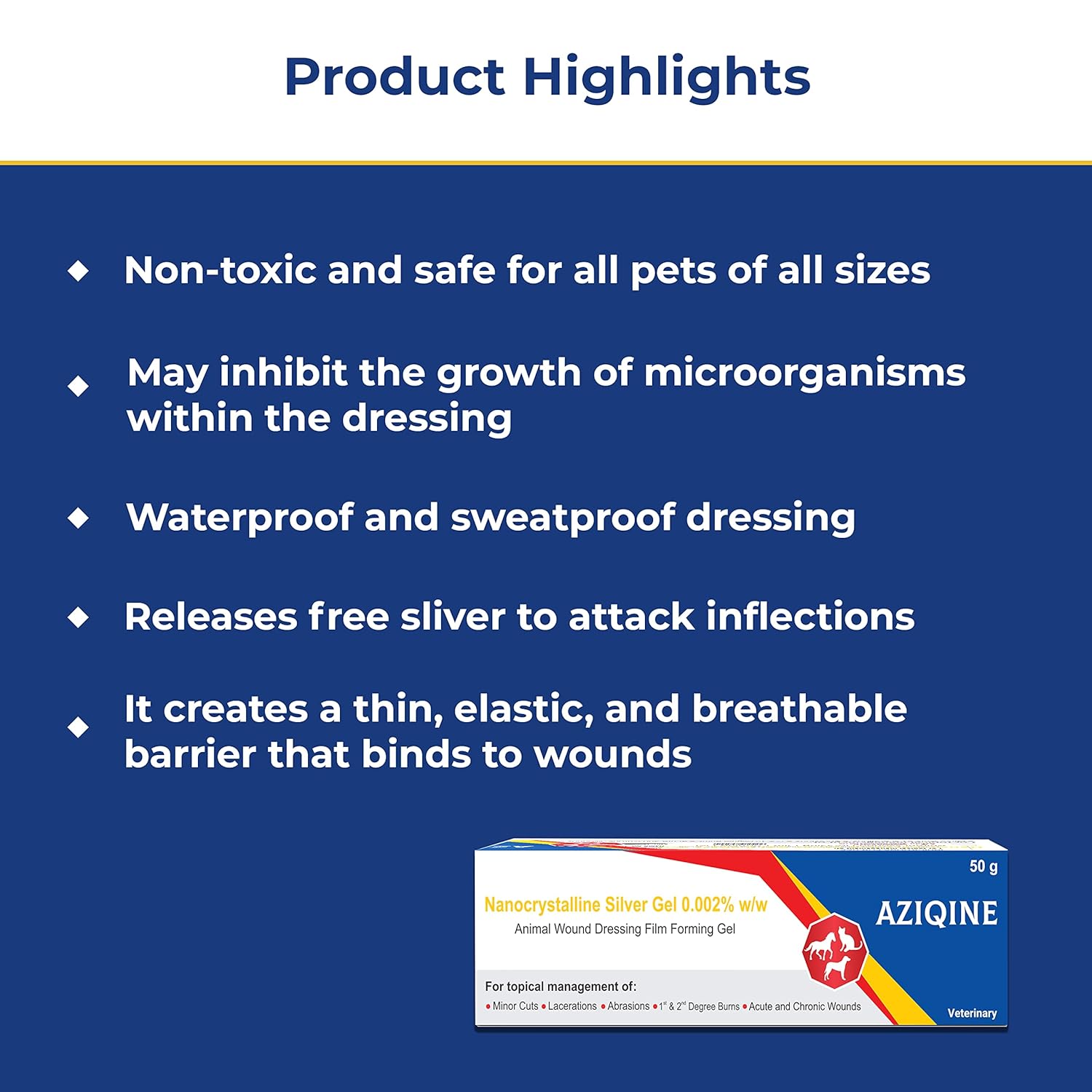 Azista Aziqine Nanocrystalline Silver Gel is a veterinary wound management formulation designed to support the healing of minor cuts, lacerations, abrasions, burns, and acute or chronic wounds in animals. Powered by Nanocrystalline Silver (0.002% w/w), this gel helps create a protective film barrier over the wound surface.