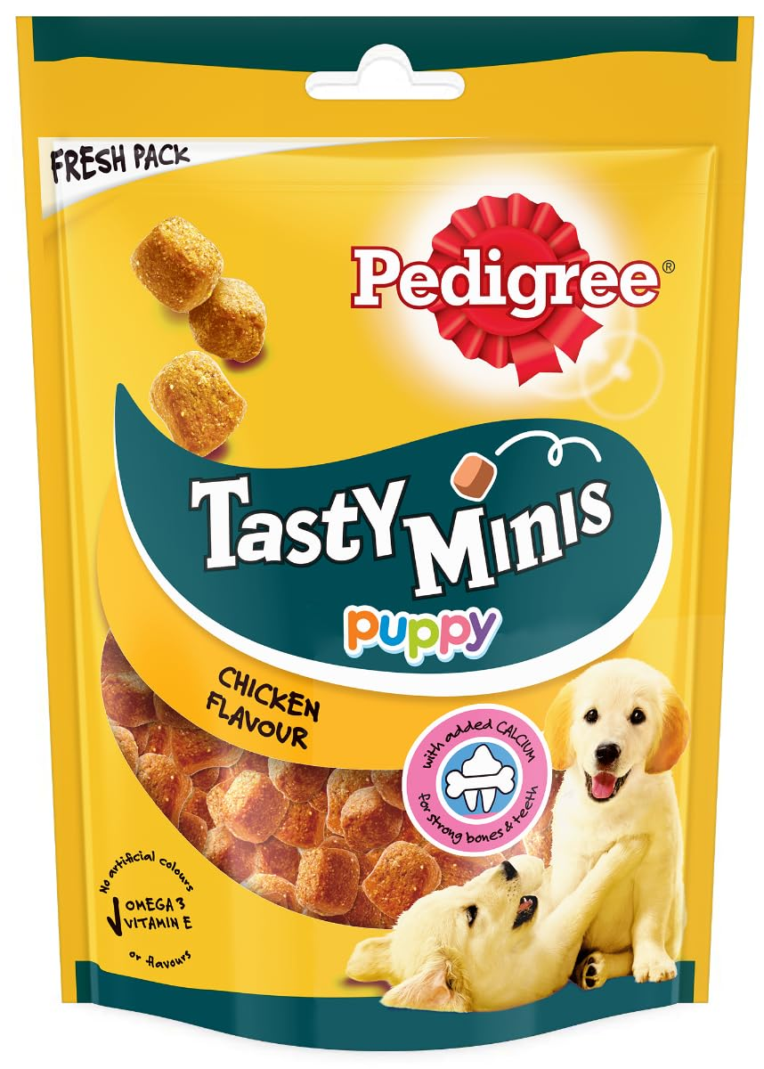 Pedigree Tasty Minis Puppy are complementary bite-sized treats for dogs specially formulated for puppies aged 4-18 months. These chicken-flavoured cubes are designed as training rewards with added nutrients to support your puppy's development, including calcium for strong bones and teeth.