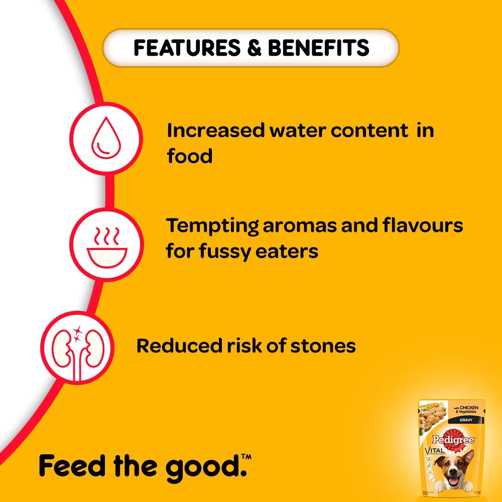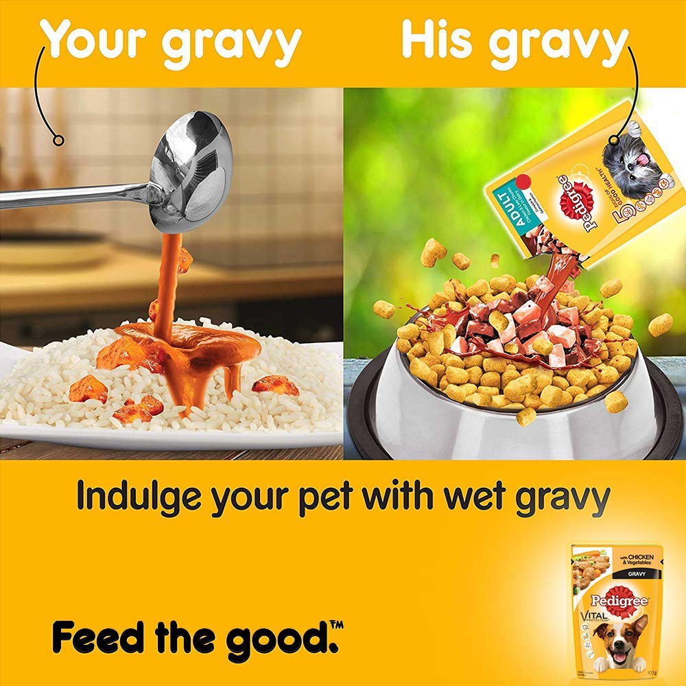 Pedigree wet dog food is a nutritious and balanced meal for your pet dog. Made with high quality ingredients, Pedigree provides dogs the 5 Signs of Good Health healthy skin and coat, strong bones and teeth, healthy digestive system, strong muscles and strong immune system. Containing a higher moisture content, Pedigree gravy food pouches are especially required for the hot season as they help keep your pooch hydrated and therefore, energetic. It can be mixed with any meal - Pedigree dry food or home cooked food - to enhance taste and improve moisture-content. The tempting aroma and flavour of wet dog food is also effective in attracting fussy eaters into eating their meal. The entire Pedigree Dog food range is formulated by research done by the Waltham Centre for Pet Nutrition, a leading scientific authority in pet nutrition and well-being for over 50 years. Everything we do at Pedigree is for the love of dogs because dogs bring out the good in us and Pedigree Pet food brings out the good in them.