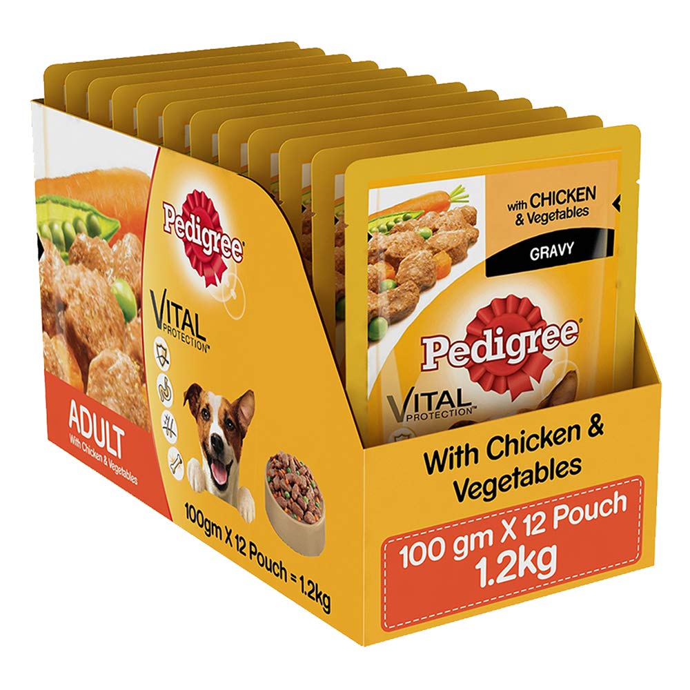 - This Pedigree Adult Wet Dog Food Gravy with Chicken & Vegetables full of flavour. It contains Vitamin E to support your pet's immune system and natural fibre which helps better digestion. Omega 6 from Sunflower oil and Zinc keeps the skin and coat healthy.