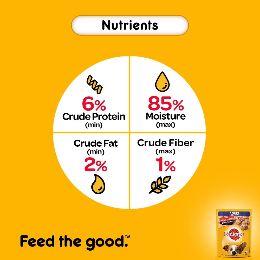 - Pedigree Wet Adult Dog Food Chicken and Liver Chunks contains 8% Min Protein in addition to 4% Min Fat & 3% Max Fiber & 85% Max Moisture