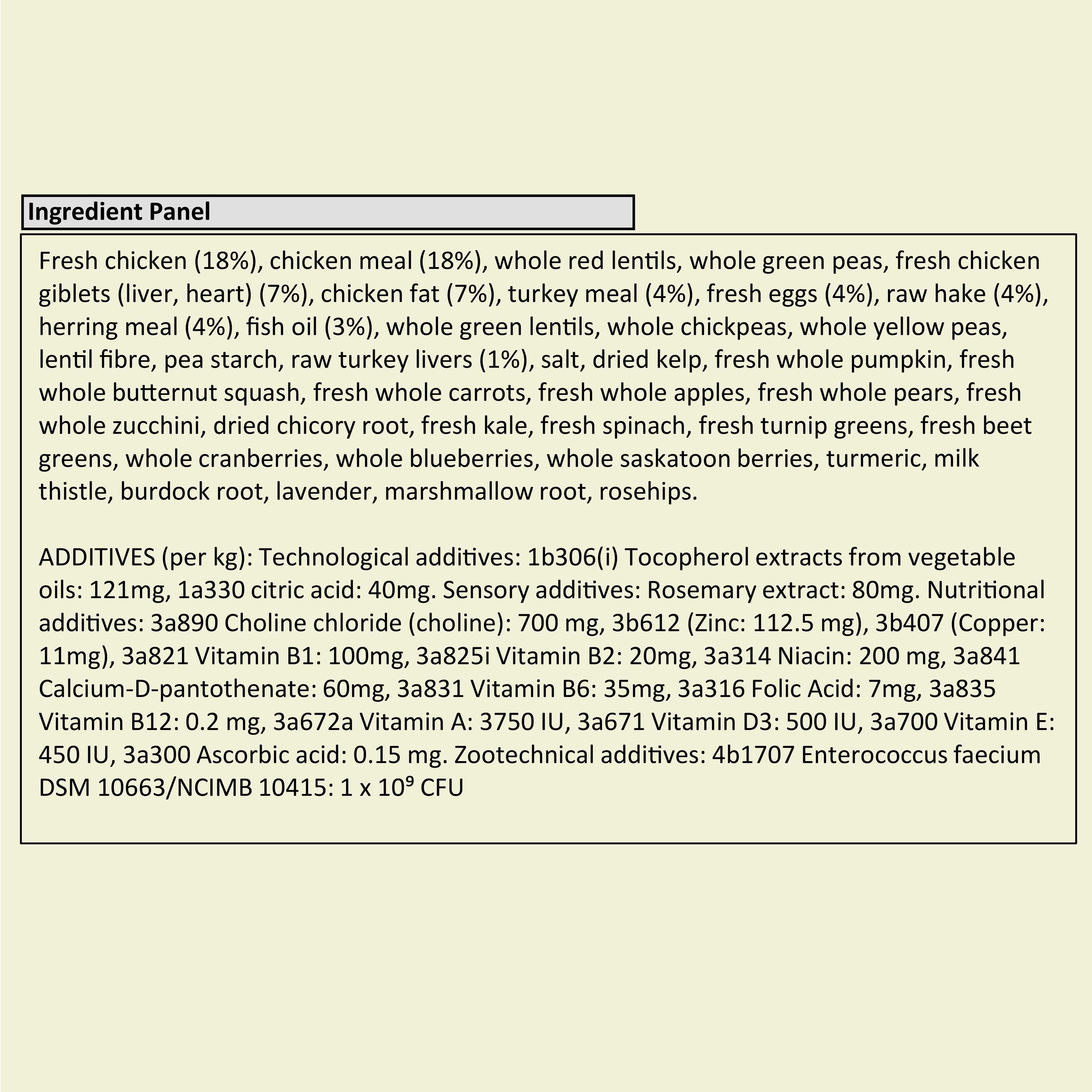 • 1st ingredient is fresh Canadian chicken. Our fresh ingredients use refrigeration as the sole method of preservation and our raw ingredients are frozen at their peak freshness.