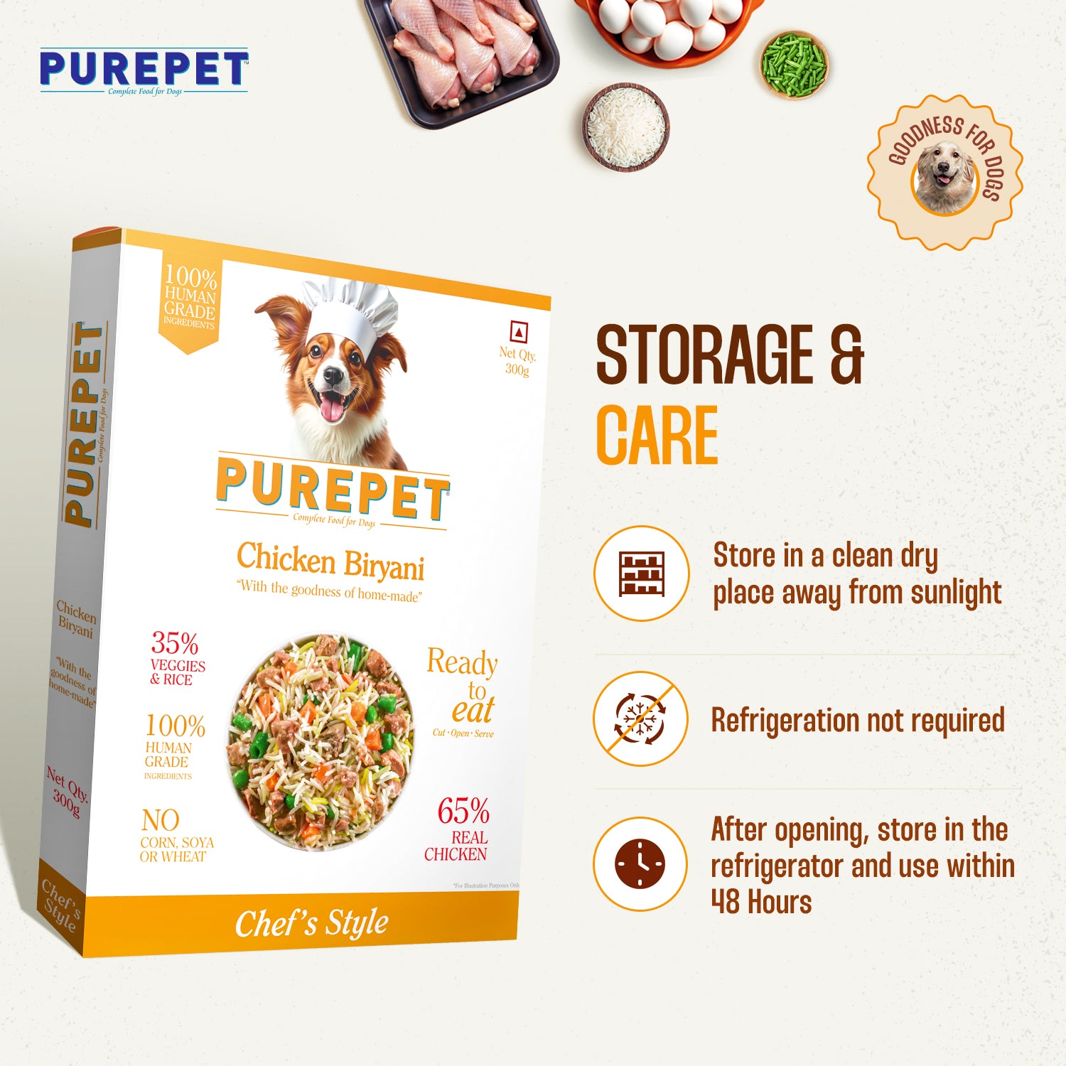 Say hello to Purepet Chef's Style Homemade Meals — cooked with care, backed by science! Purepet Chicken Biryani is a ready-to-eat, 100% human-grade complete food for dogs featuring 65% real chicken combined with 35% veggies & rice. This Chef's Style formula delivers "the goodness of home-made" nutrition in a convenient cut-open-serve format. Crafted with fresh, human-grade ingredients and expertly formulated by pet nutritionists, each flavourful recipe retains essential nutrients. No corn, soya, or wheat. Packed in retort packaging, it stays naturally fresh without the use of preservatives.