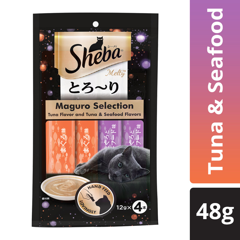 Sheba Melty Maguro Selection Creamy Cat Treat – Tuna & Seafood Flavors are Premium Hand-Fed Lickable Treats with authentic tuna and tuna & seafood flavors and smooth melty texture.
