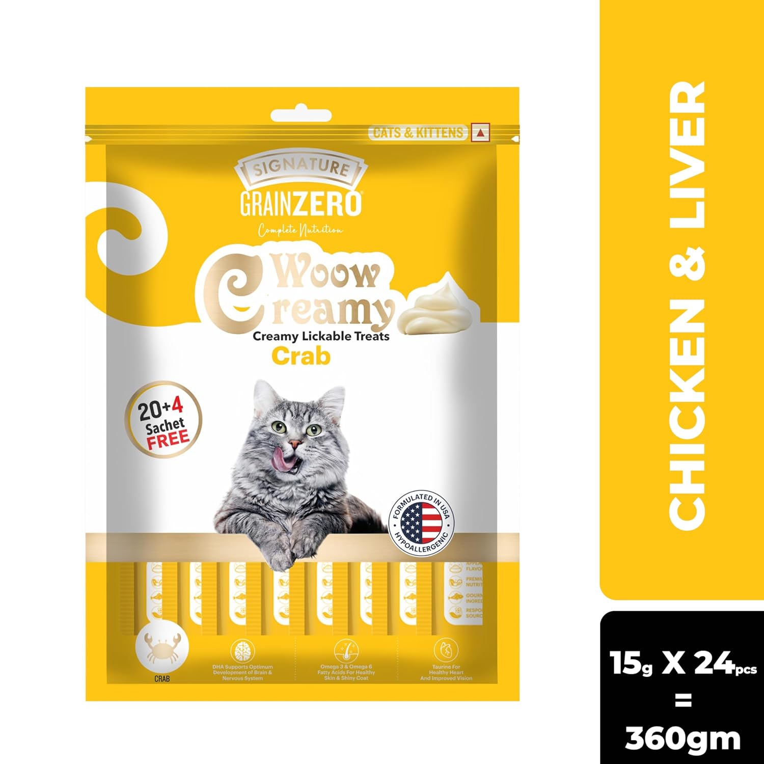 Signature GrainZero Woow Creamy Lickable Cat Treats – Crab are Premium Grain-Free Lickable Treats with crab flavor featuring smooth creamy texture for gourmet feline dining.